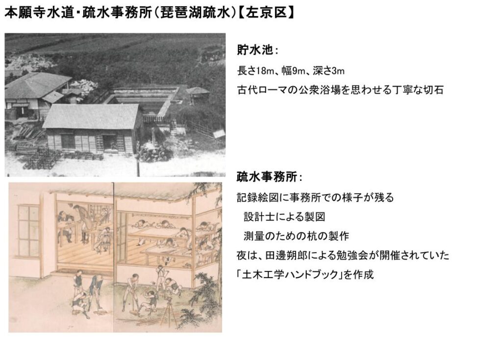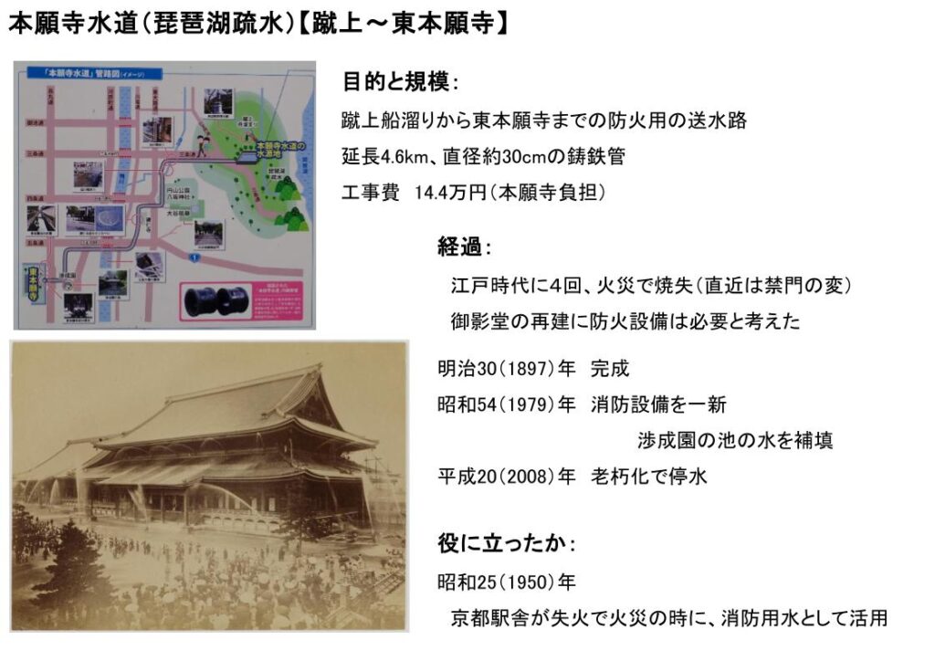 東本願寺のために蹴上船溜りから防火用の送水路を整備した。延長4.6km、直径約30cmの鋳鉄管