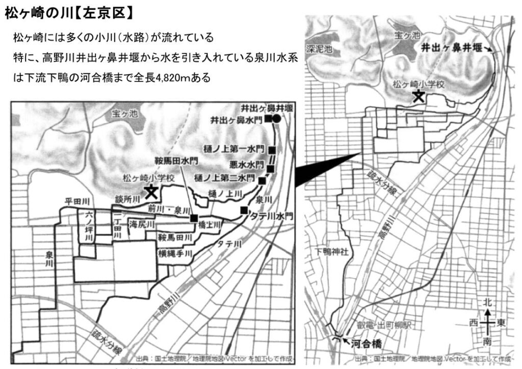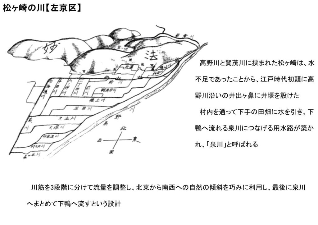 松ヶ崎には多くの小川(水路)が流れている。特に、高野川井出ヶ鼻井堰から水を引き入れている泉川水系は下流下鴨の河合橋まで全長4,820mある。