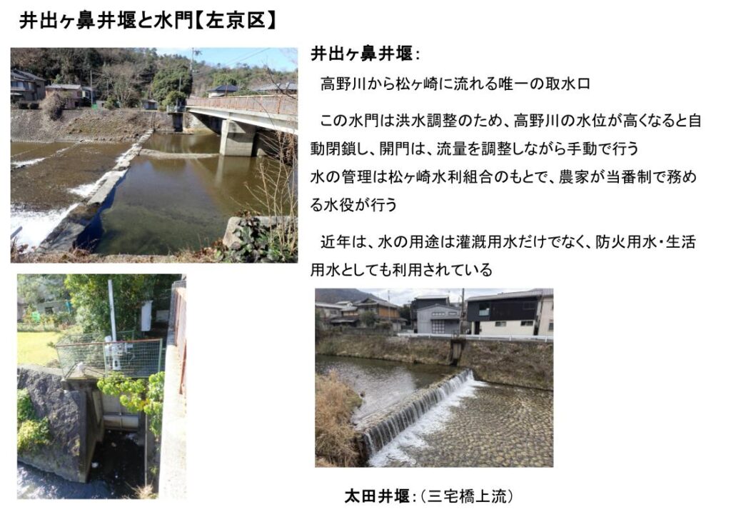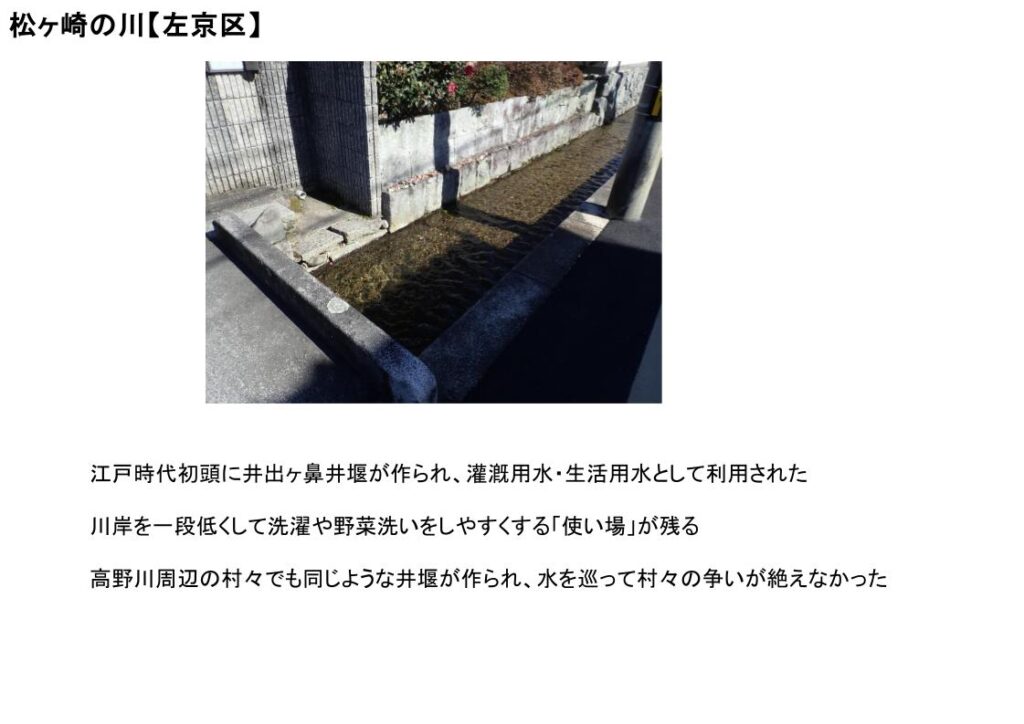 高野川周辺の村々でも同じような井堰が作られ、水を巡って村々の争いが絶えなかった。
