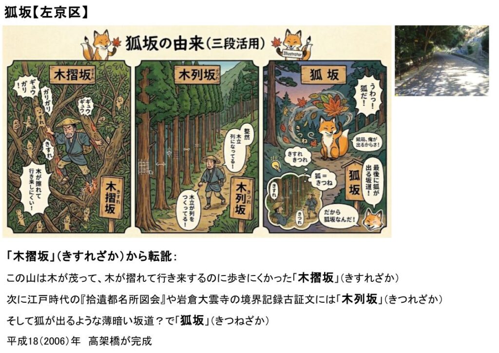その他 この山は木が茂って、木が摺れて行き来するのに歩きにくかった「木摺坂」(きすれざか)と呼ばれたのが始まりで、江戸時代の『拾遺都名所図会』や岩倉大雲寺の境界記録古証文には「木列坂」(きつれざか)と記載されている。現在は、狐が出るような薄暗い坂道?で「狐坂」(きつねざか)と呼ばれ、呼ばれ方が転訛している。