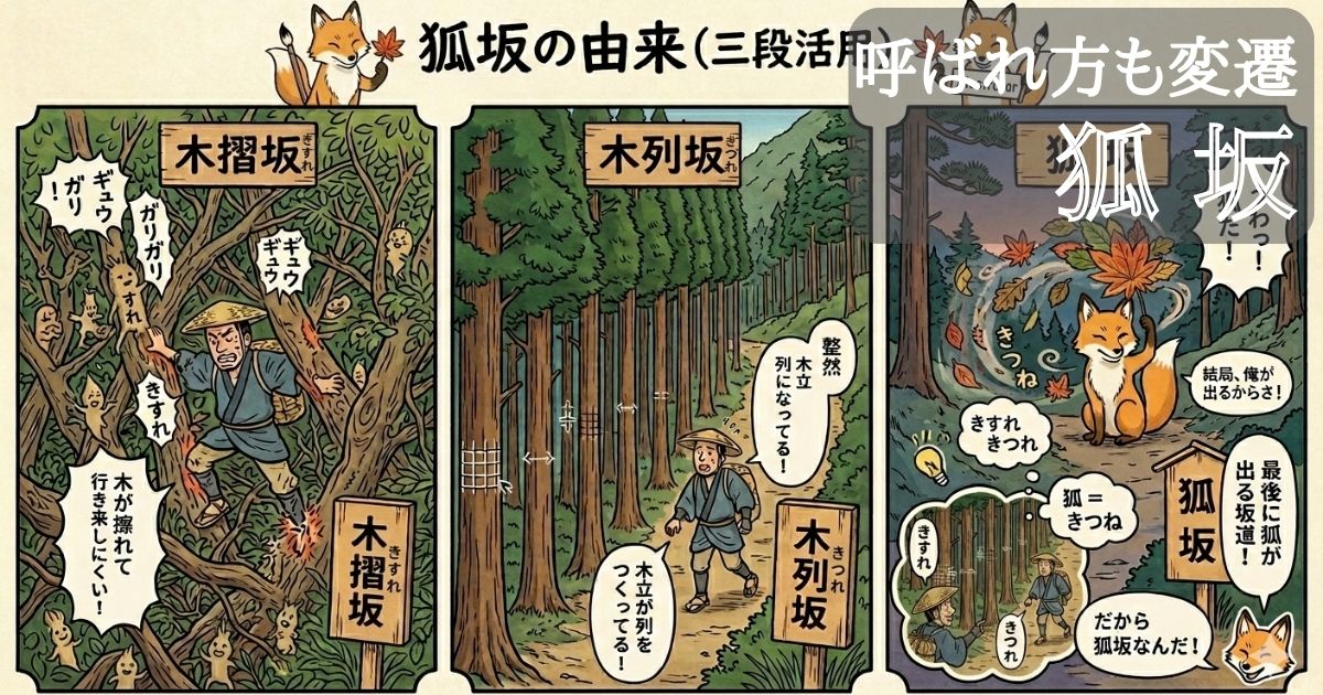 その他 この山は木が茂って、木が摺れて行き来するのに歩きにくかった「木摺坂」(きすれざか)と呼ばれたのが始まりで、江戸時代の『拾遺都名所図会』や岩倉大雲寺の境界記録古証文には「木列坂」(きつれざか)と記載されている。現在は、狐が出るような薄暗い坂道?で「狐坂」(きつねざか)と呼ばれ、呼ばれ方が転訛している。