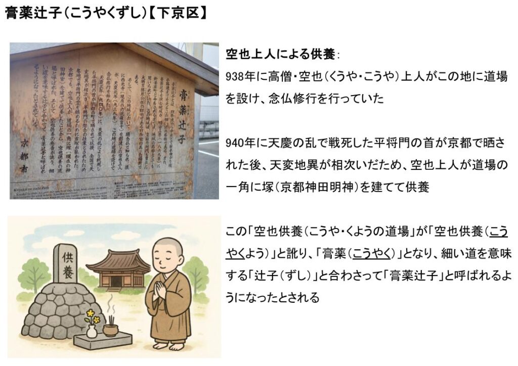 この「空也供養(こうや・くよう)の道場」が「空也供養(こうやくよう)」と訛り、「膏薬(こうやく)」となり、細い道を意味する「辻子(ずし)」と合わさって「膏薬辻子」と呼ばれるようになったとされる。