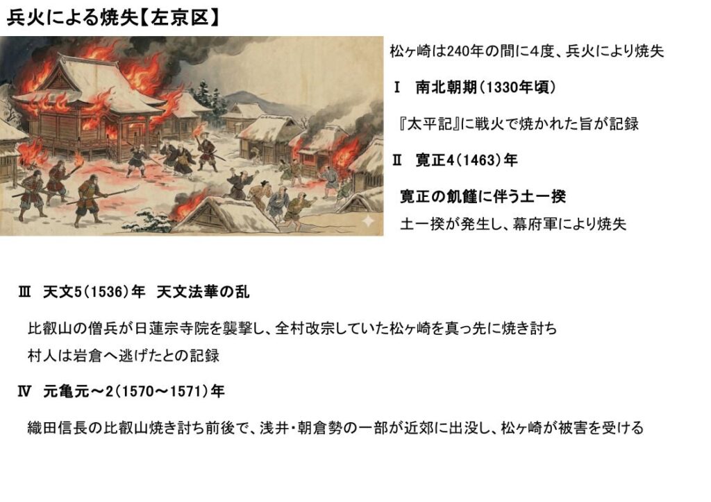 Ⅲ 天文5(1536)年の焼失は、天文法華の乱によるもので、比叡山の僧兵が日蓮宗寺院を襲撃し、全村改宗していた松ヶ崎を真っ先に焼き討ちされることとなった。村人は岩倉へ逃げたとの記録がある。