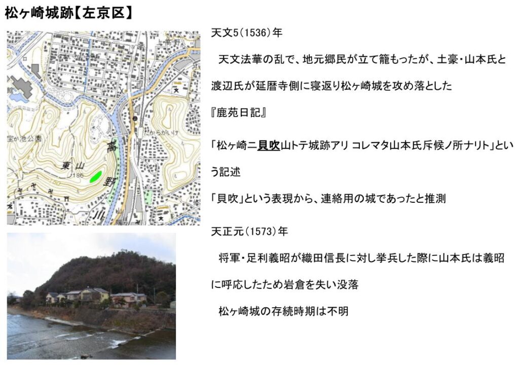 『鹿苑日記』には、「松ヶ崎ニ貝吹山トテ城跡アリ コレマタ山本氏斥候ノ所ナリト」という記述されている。「貝吹」という表現から、連絡用の城であったと推測される。