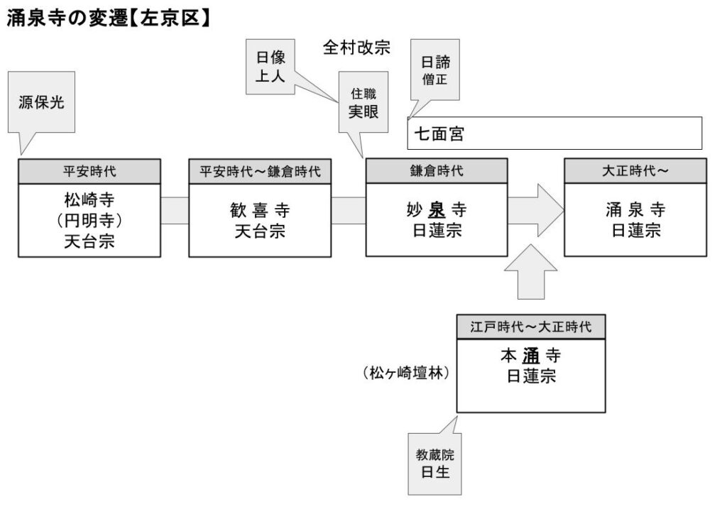 大正7(1918)年に北東の本涌寺と合併し、涌泉寺となる。 跡地は、松ヶ崎小学校となる。