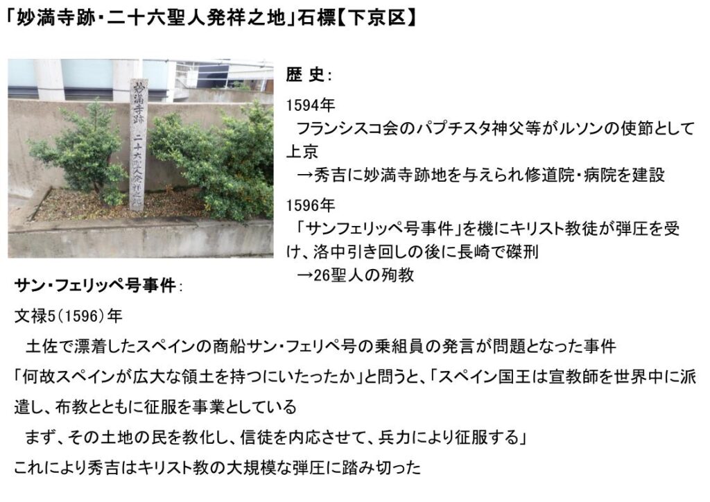 1596年の「サンフェリッペ号事件」を機にキリスト教徒が弾圧を受け、洛中引き回しの後に長崎で磔刑に処せられ、26聖人が殉教する。