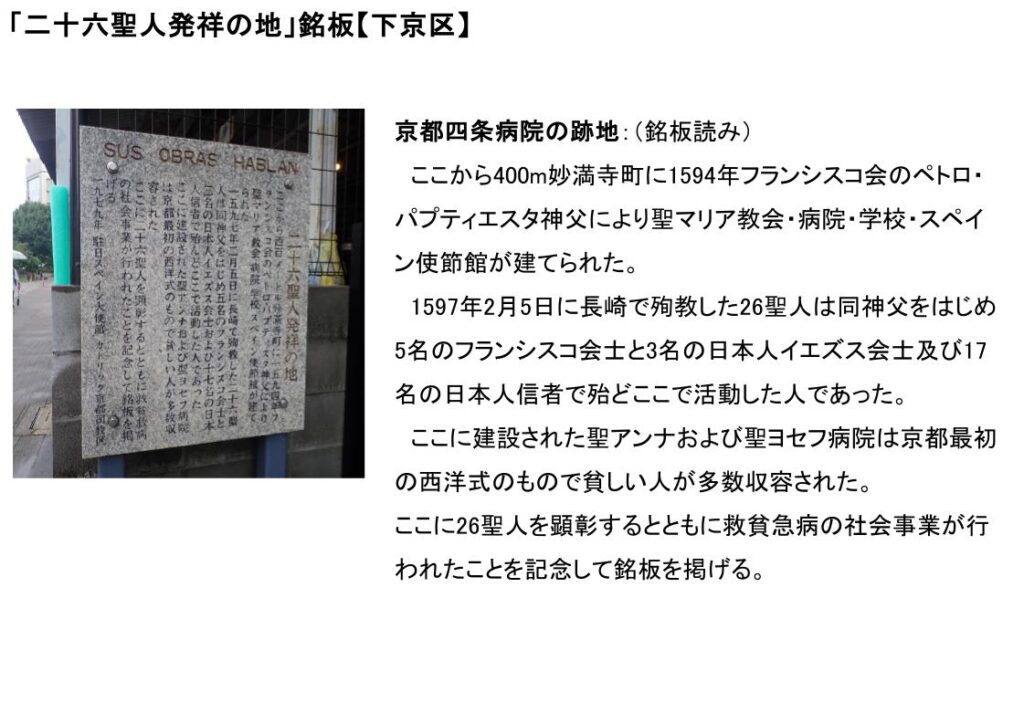 「二十六聖人発祥の地」銘板(京都四条病院の跡地):銘板読み