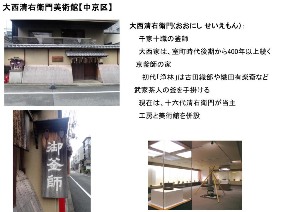 その他千家十職の釜師。大西家は、室町時代後期から400年以上続く京釜師の家であり、初代「浄林」は古田織部や織田有楽斎など武家茶人の釜を手掛ける。