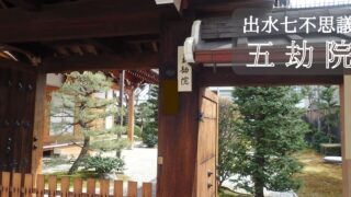 お寺 五劫院【上京区】 享保9(1724)年に僧喚誉が開祖した。本堂は、天明8(1788)年の火災後に再建されたものであり、通常非公開である。寝釈迦(出水七不思議)門のくぐり戸(小袖門)の上にある框の木目が、西枕で横たわる釈迦の姿に見える。地図を見る 2025.08.24 お寺