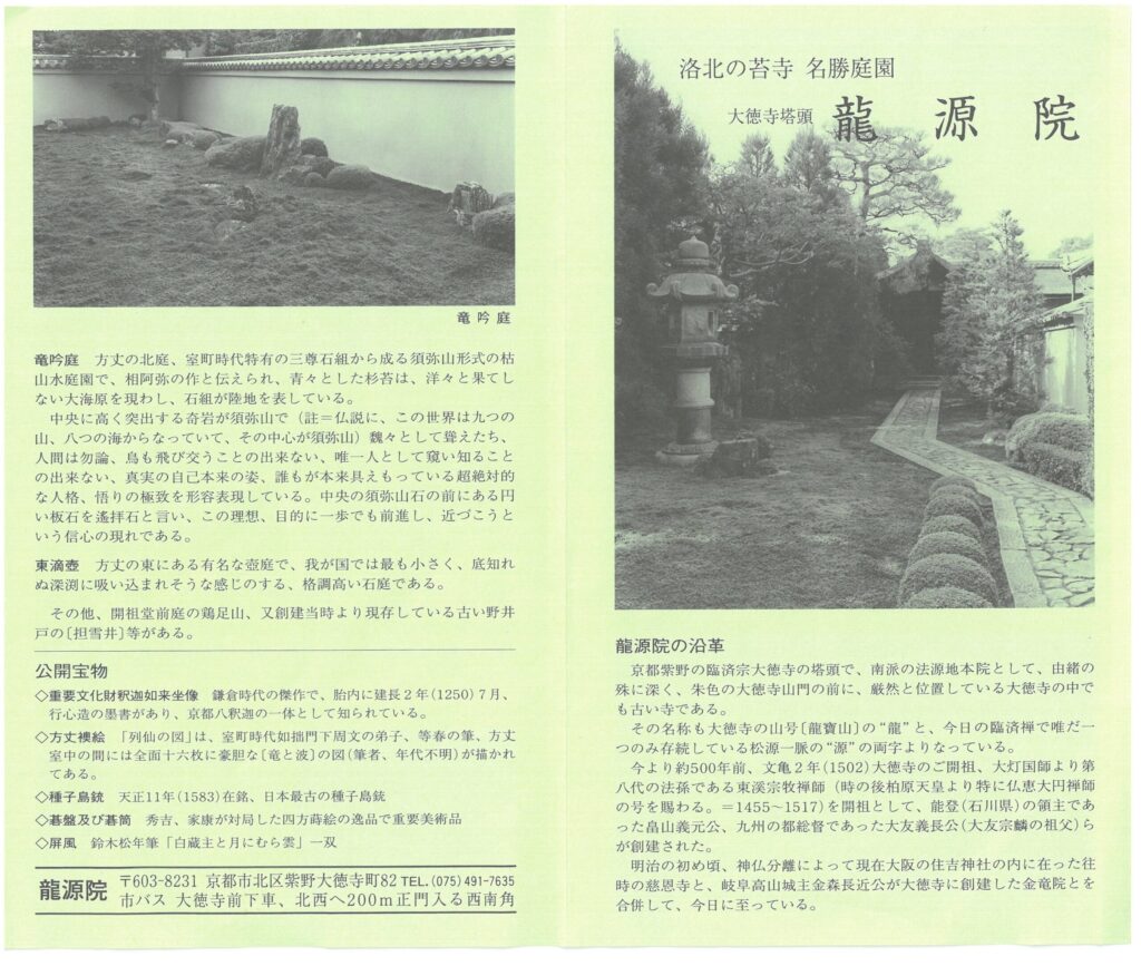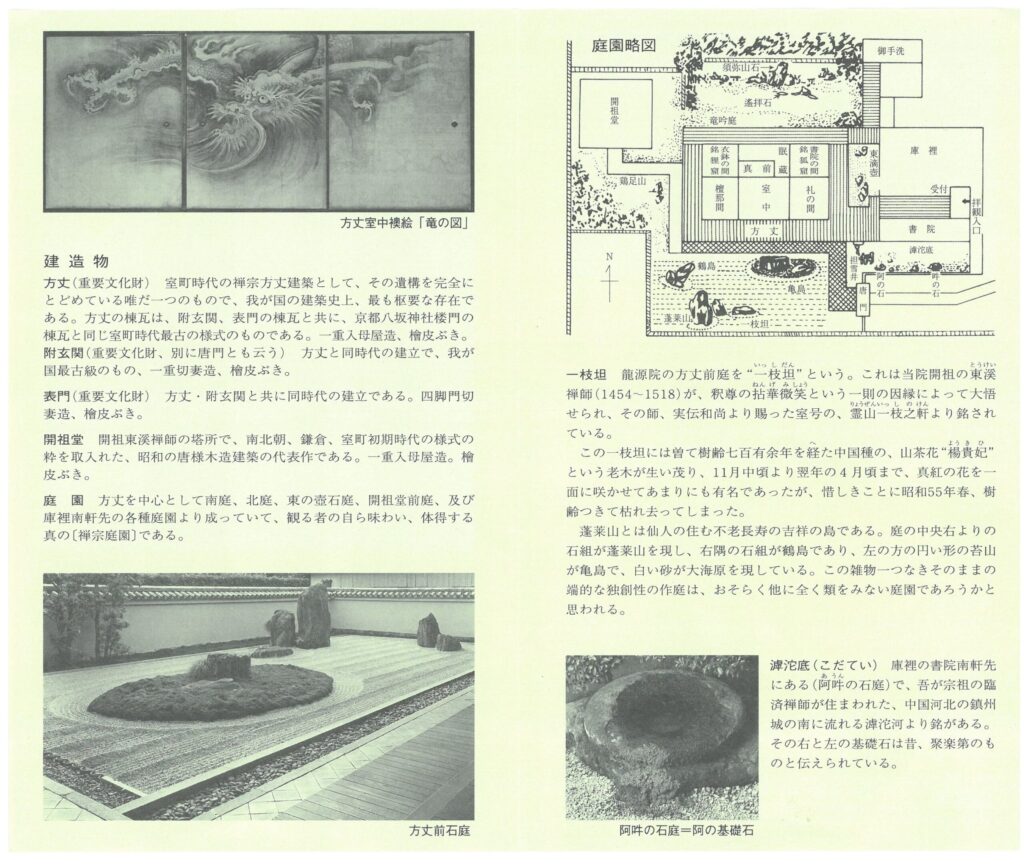 竜吟庭(とうてきこ):方丈の北庭で相阿弥の作と伝わる。枯山水の須弥山形式である。