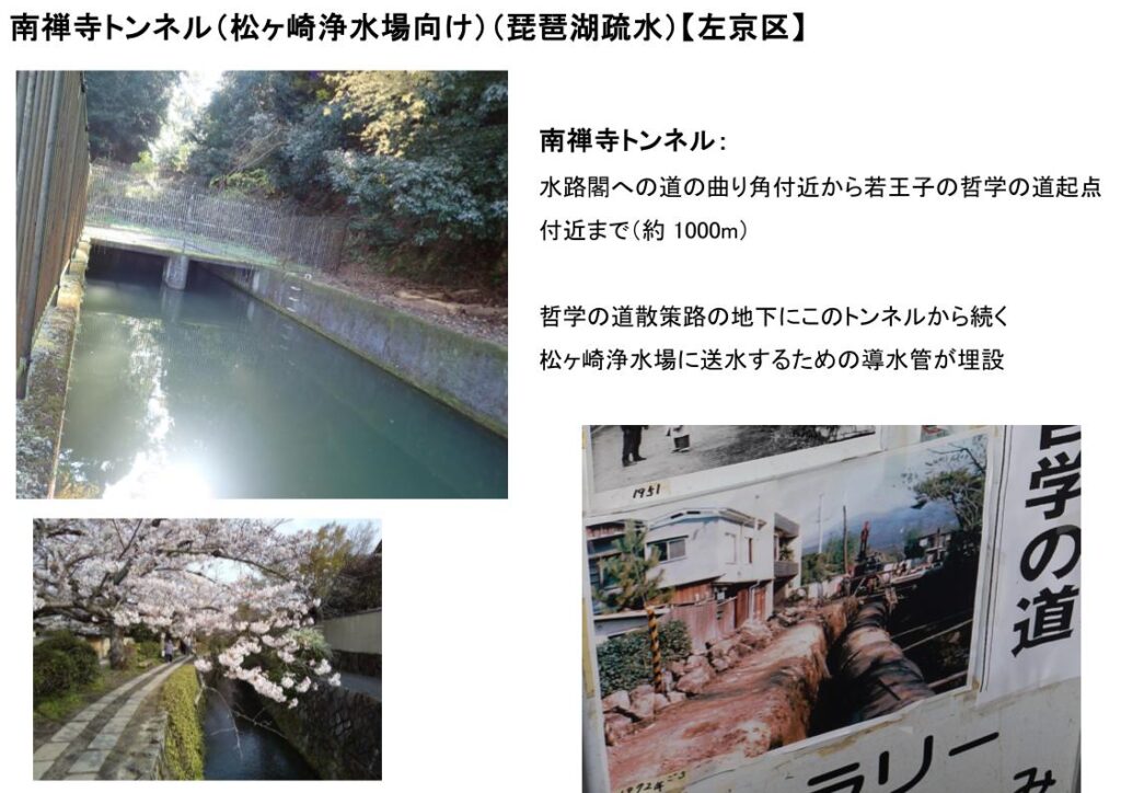 哲学の道の散策路の地下に、このトンネルから続く松ヶ崎浄水場への送水するための導水管が埋設されている。