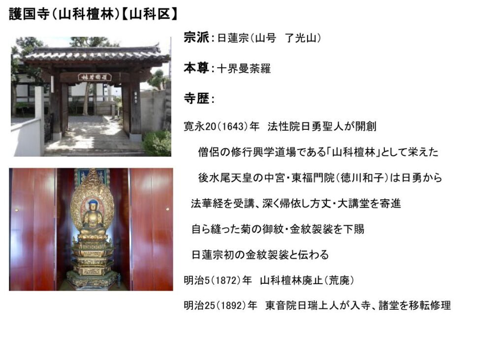 寛永20(1643)年に、法性院日勇聖人が開創し、僧侶の修行興学道場である「山科檀林」として栄えた。後水尾天皇の中宮・東福門院(徳川和子)は日勇聖人から、法華経を受講し、深く帰依したことから、方丈・大講堂の寄進を受けた。また自ら縫った菊の御紋・金紋袈裟を下賜された。日蓮宗初の金紋袈裟と伝わっている。