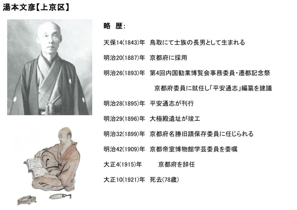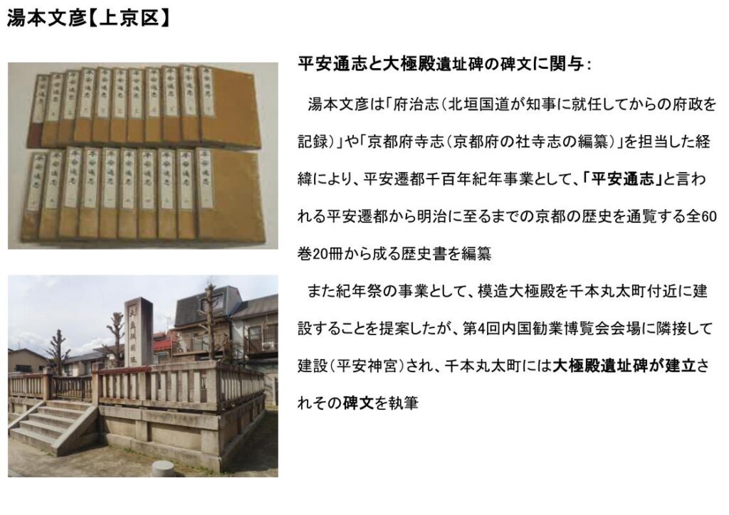 湯本文彦は「府治志(北垣国道が知事に就任してからの府政を記録)」や「京都府寺志(京都府の社寺志の編纂)」を担当した経緯により、平安遷都千百年紀年事業として、「平安通志」と言われる平安遷都から明治に至るまでの京都の歴史を通覧する全60巻20冊から成る歴史書を編纂した